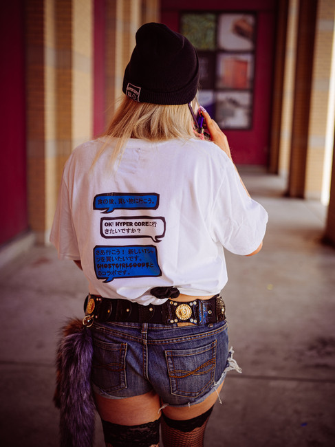 The third outfit concluded our brand collab line up with our newest collaboration with HYPER CORE called HYPER GIRL. Our model was styled in a gyaru-esc look while featuring the collab beanie and t-shirt we designed. The shirt design itself was a piece by Hisacy of HYPER CORE called HYPER BEATS. GHOST GiRL and her friends then invaded the artwork!
