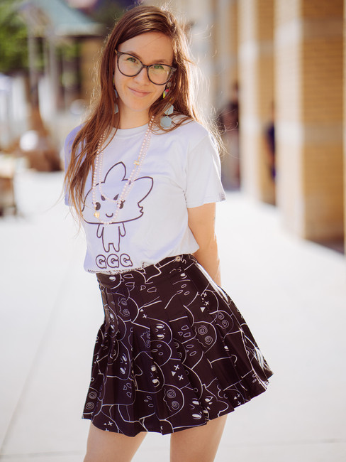 We also introduced a new pleated skirt with the GHOSTOWN PARADE Night Time print. The skirt has built in shorts too! We will release this skirt with the refined GHOSTOWN PARADE print on it (and it will also be in the correct orientation hehehe! This was just the sample.) Our model is also wearing the GGG White Simple Tee, which is a nice balance in comparison to the busy print of GHOSTOWN PARADE.